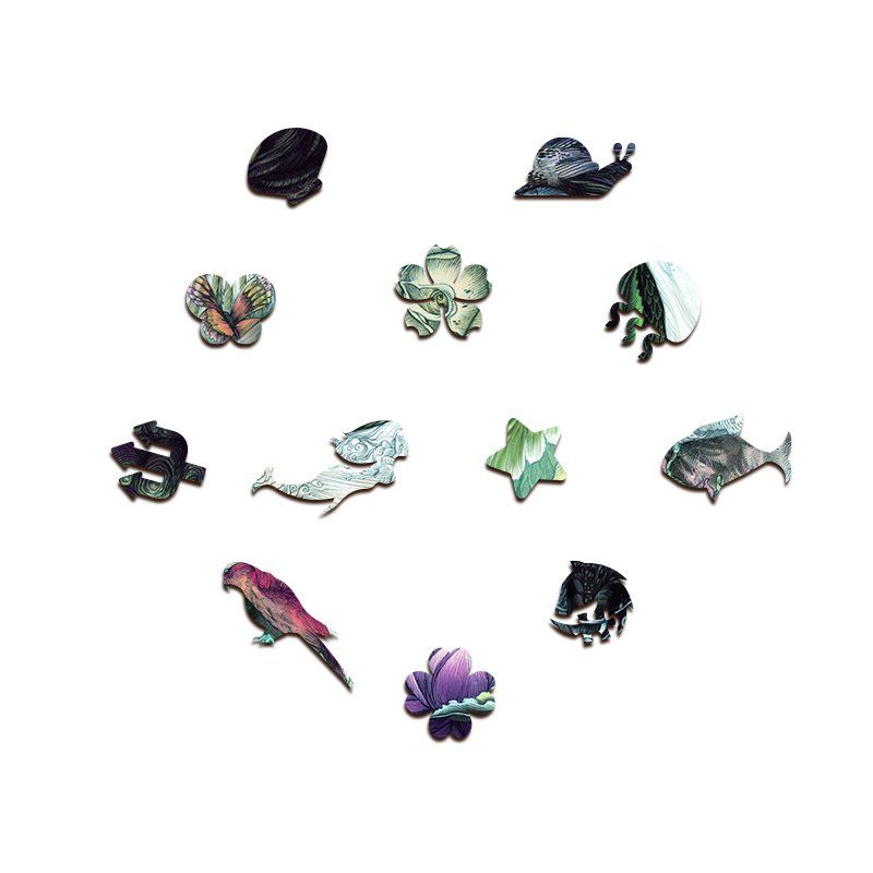 Jedes Teil hat eine einzigartige Form und stellt entzückende Tiere, Blumen und Pflanzen dar. Lebendige Farben und komplizierte Designs erwecken die Puzzles zum Leben.